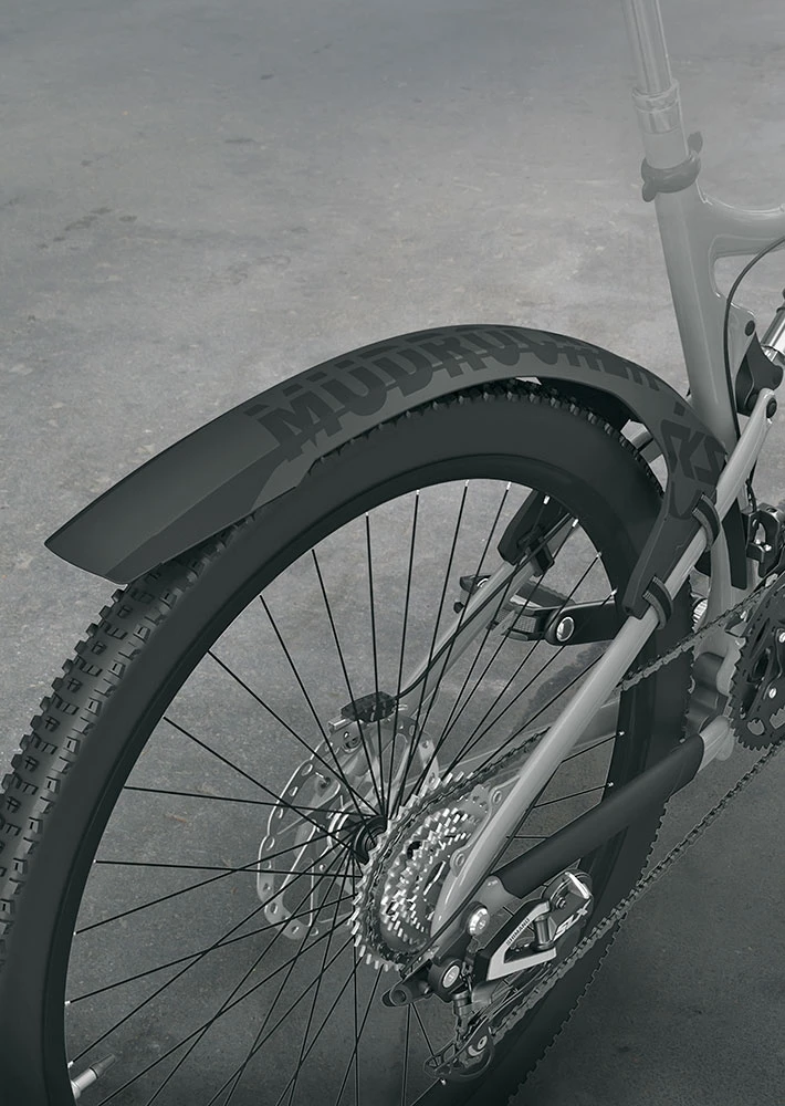 Il se fixe sur les barres de la fourche arrière à l’aide d’attaches auto-agrippantes caoutchoutées. Le coussin souple en forme de coin dans les supports de fixation protège le cadre, peut être tourné et utilisé dans deux positions différentes pour le réglage de la hauteur. Ainsi, la distance par rapport au pneu peut être parfaitement ajustée.